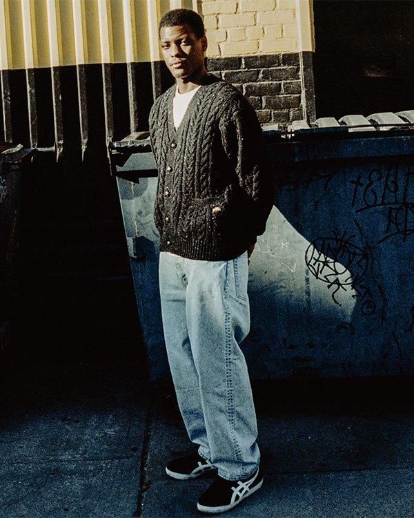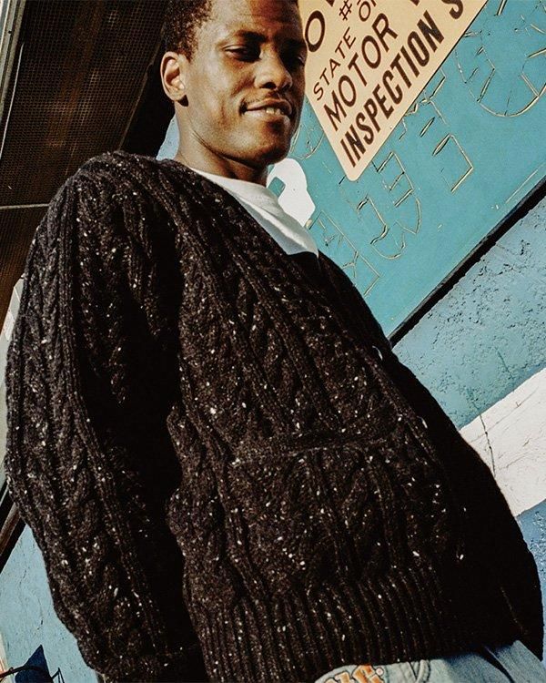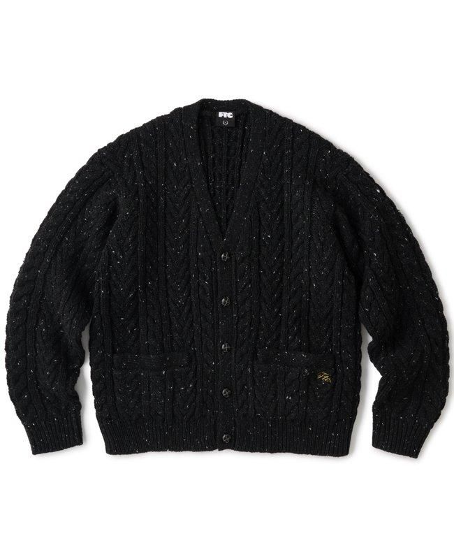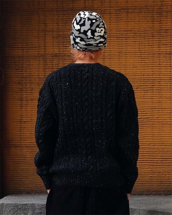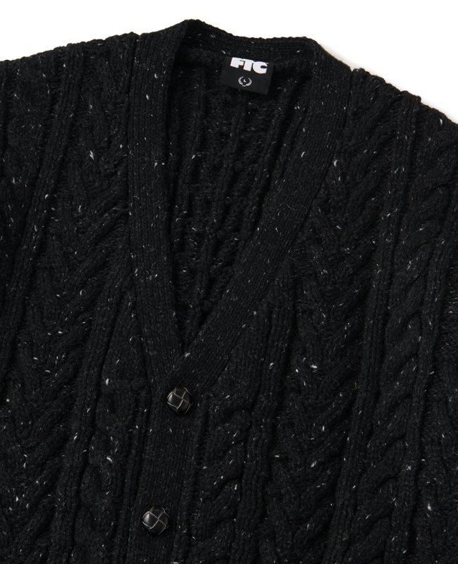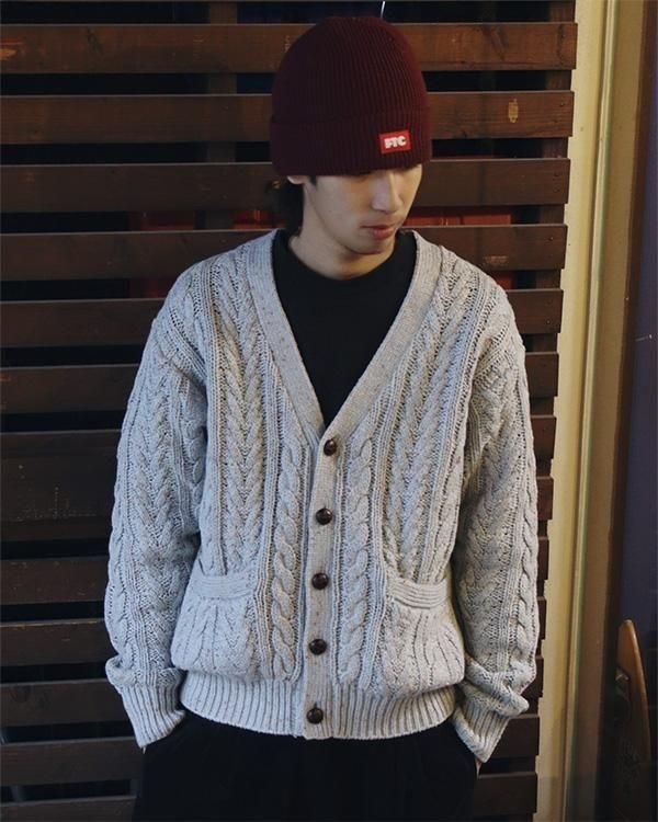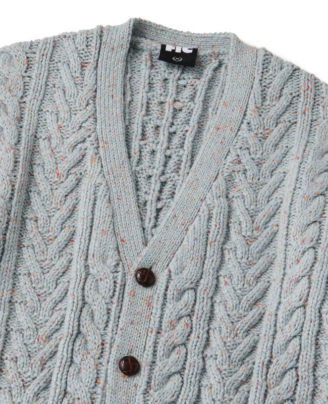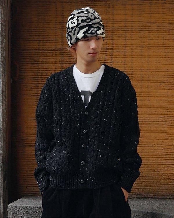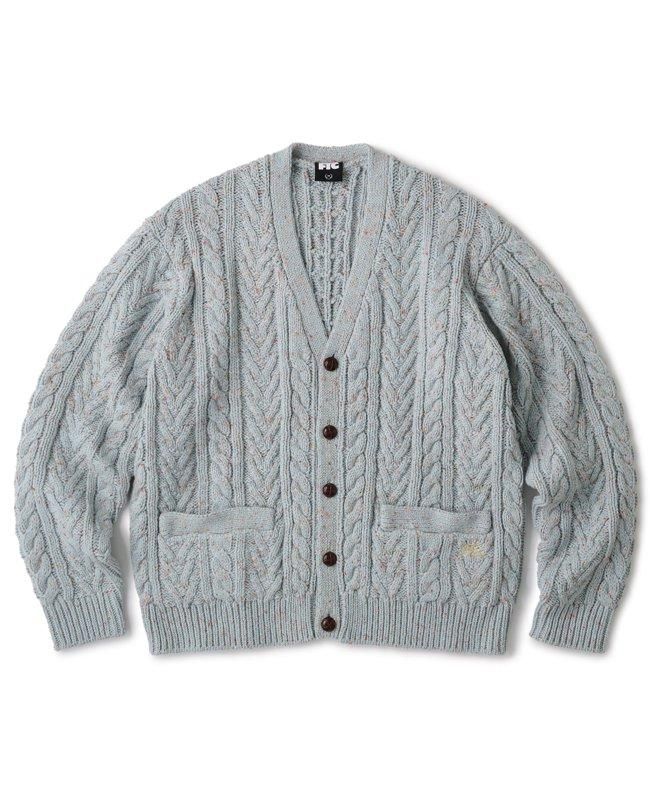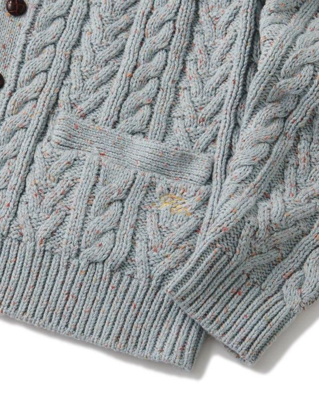 オリジナルのケーブル柄で編み立てたウールブレンドカーディガン。