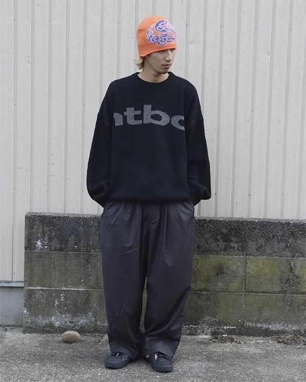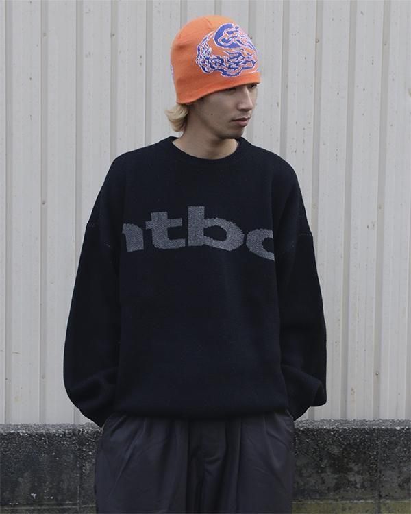 右袖から左袖までかかるビッグロゴをジャカード編みで表現した厚手のプルオーバーニットトップ。