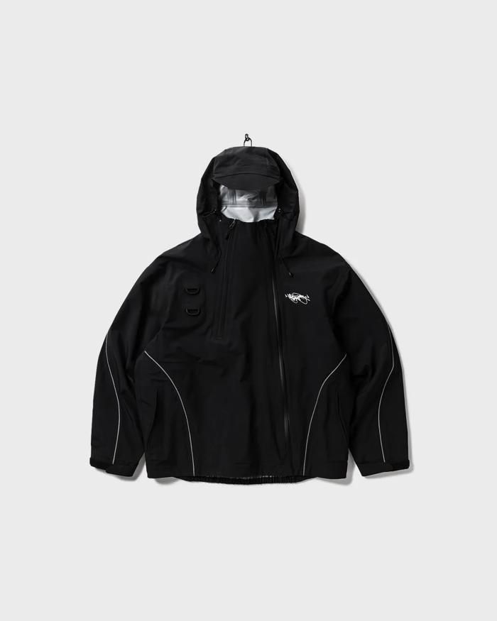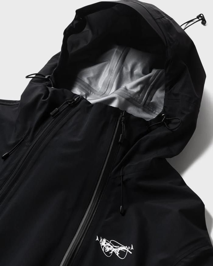 従来のマウンテンパーカをベースに両ブランドのロゴと曲線を随所に落とし込んだデザイン。