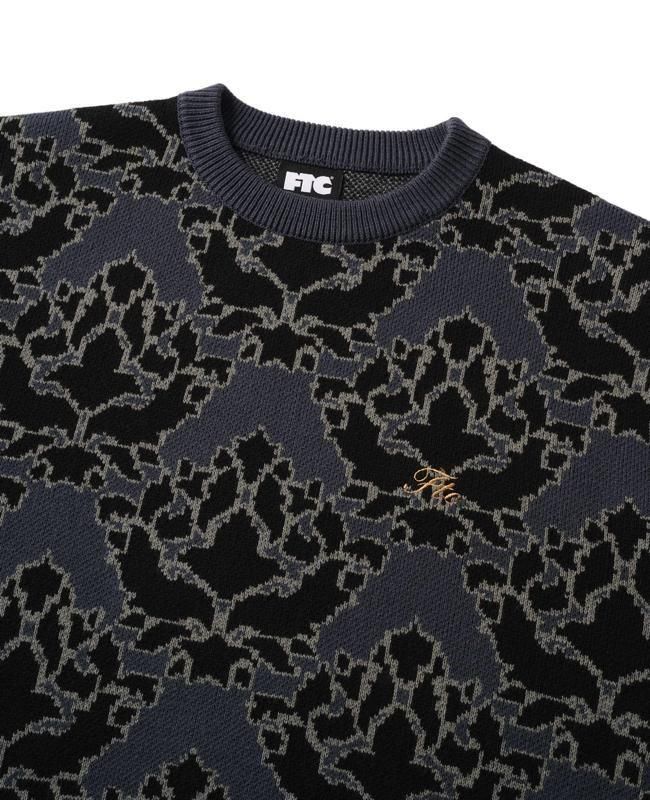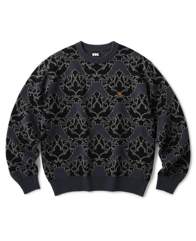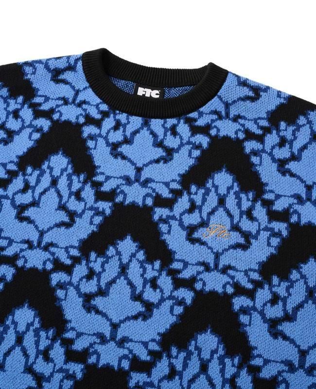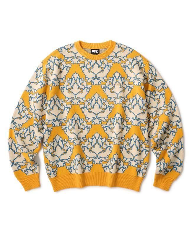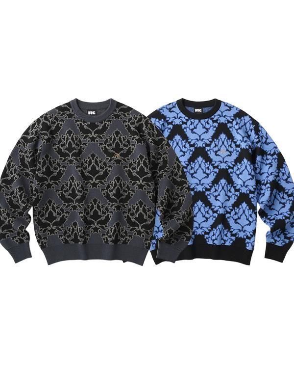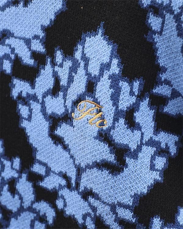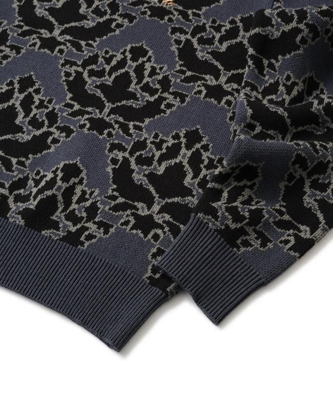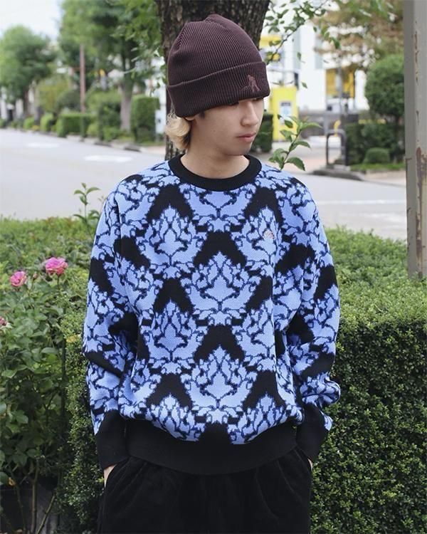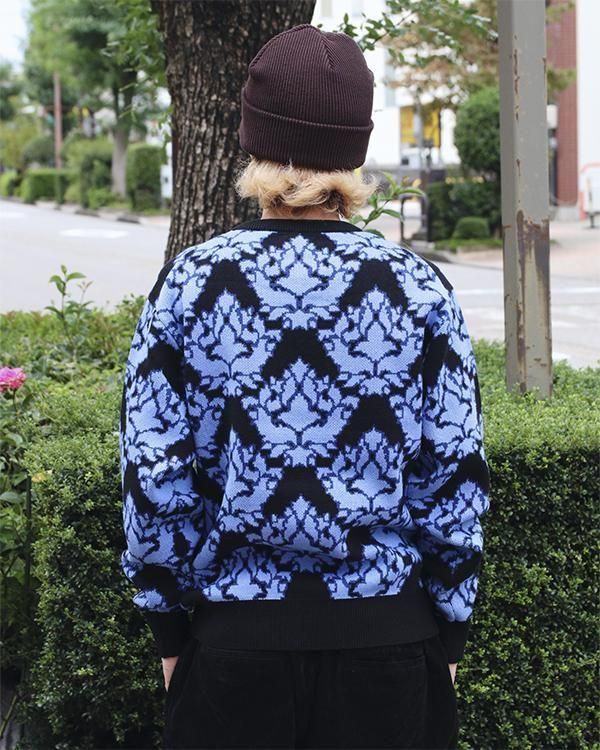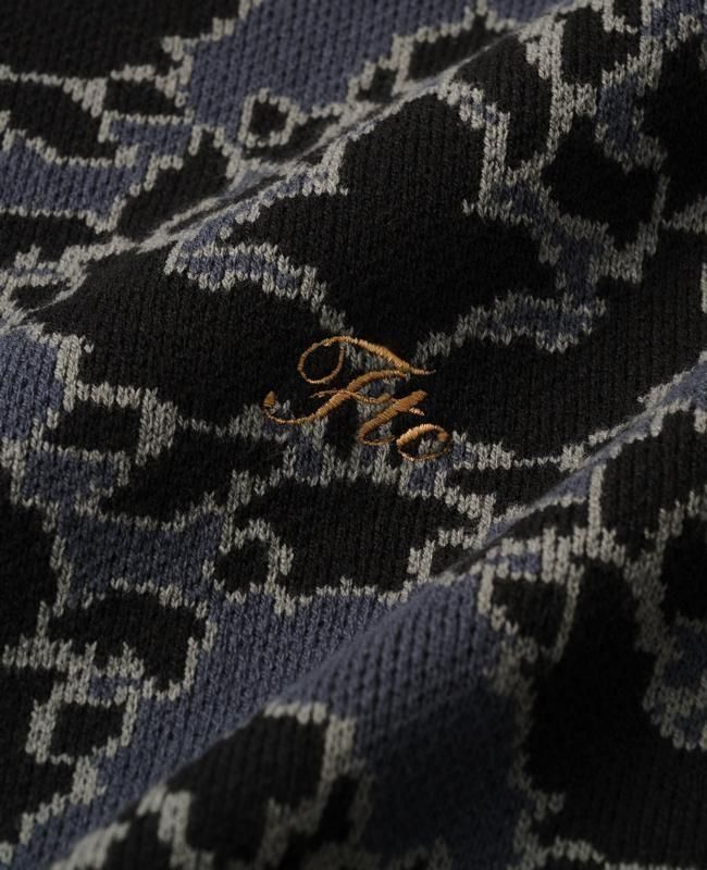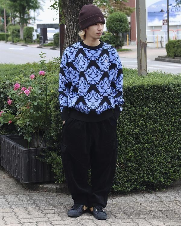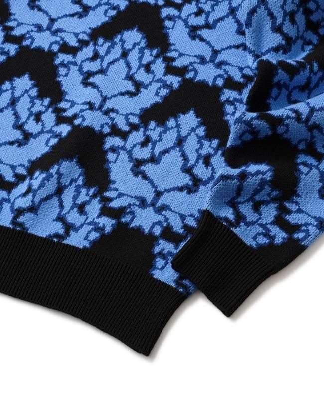 コットン/アクリル糸をダブルジャガードで編み立てたオリジナル総柄セーター。