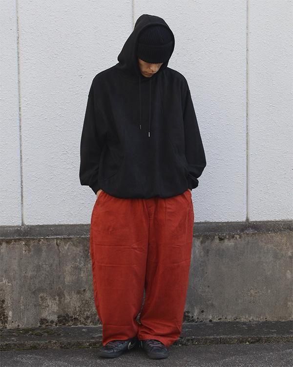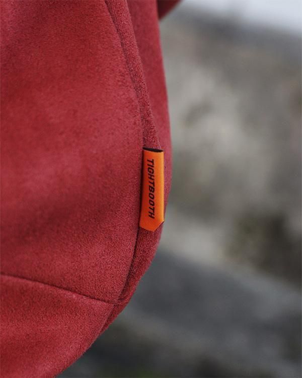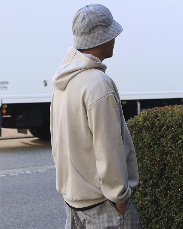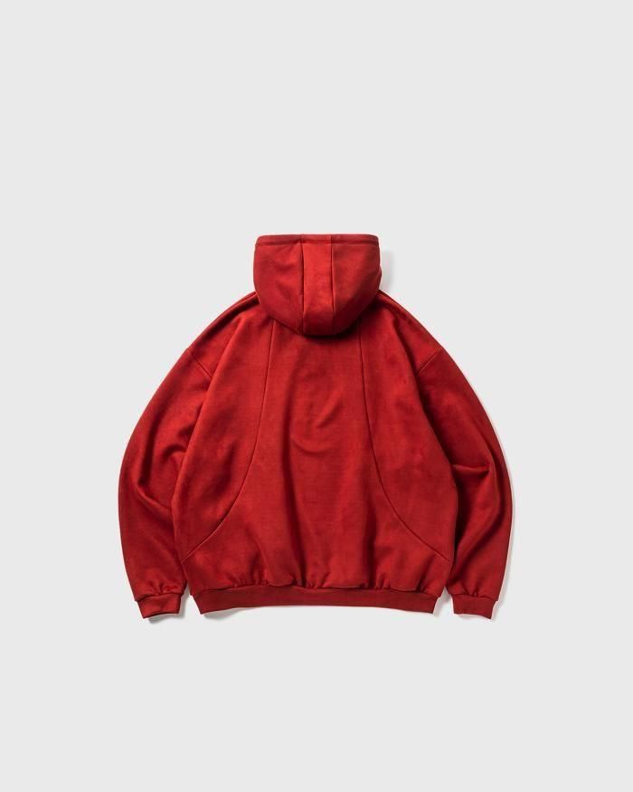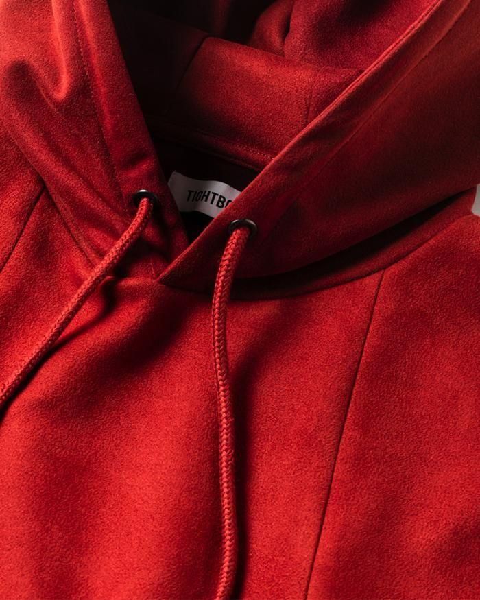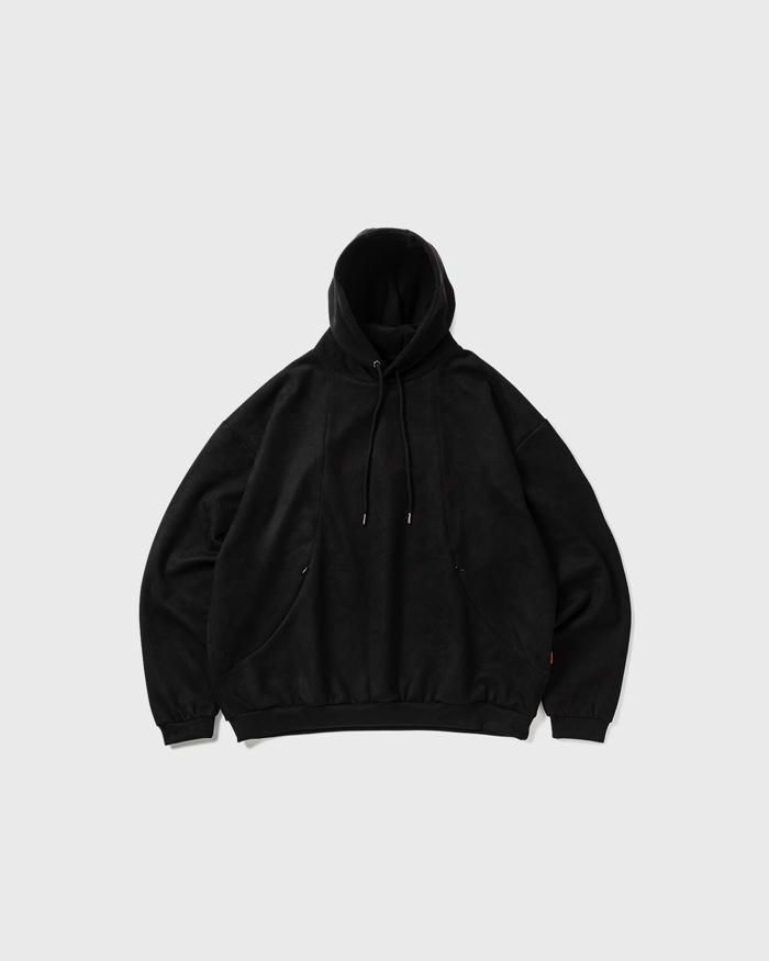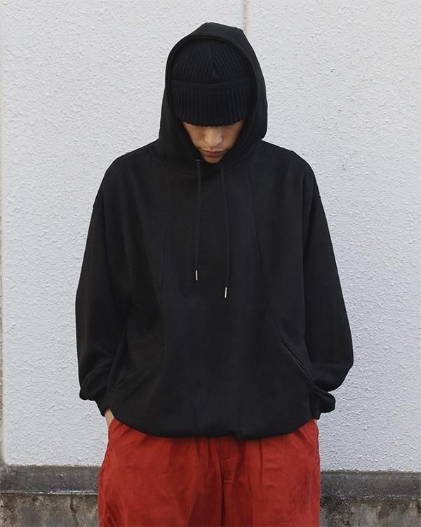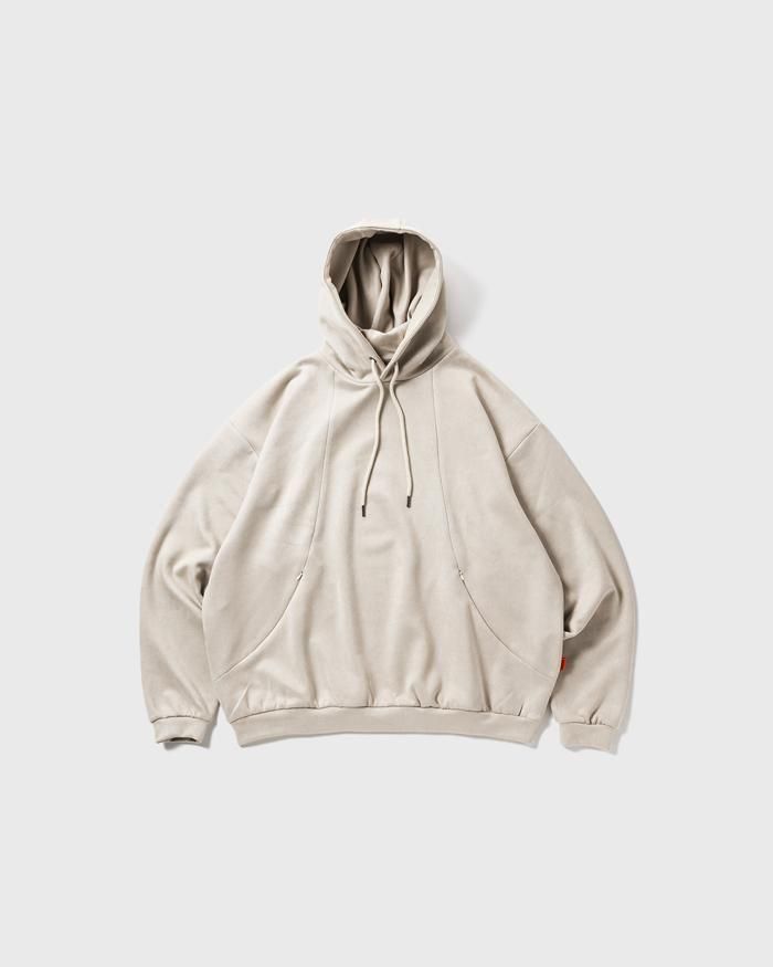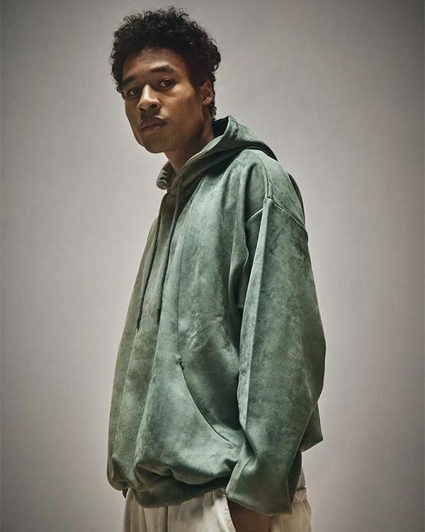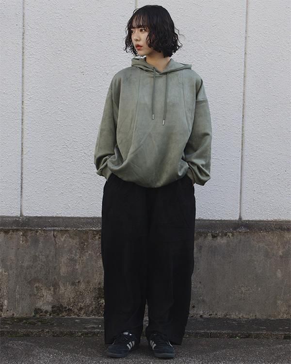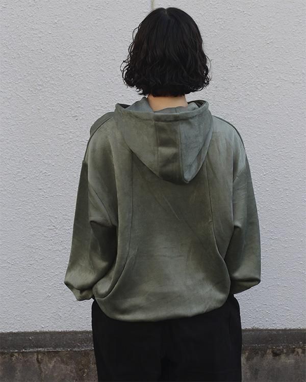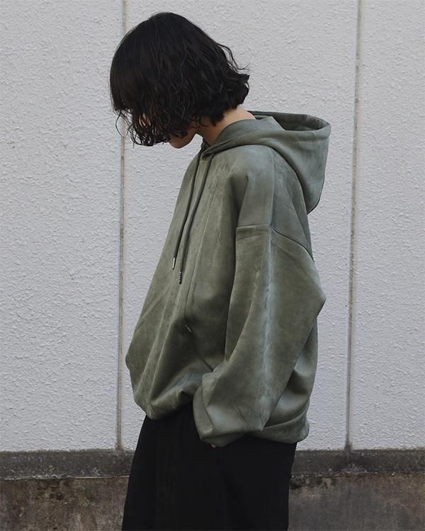 スエード調の質感が特徴的な生地を使用したプルオーバーフーディ。