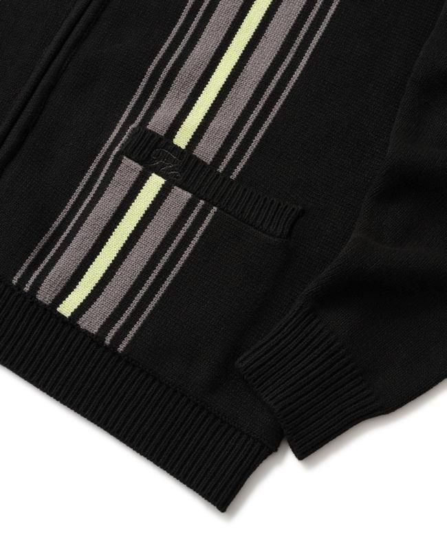 コットン/アクリル糸で編み立てたオリジナルストライプ柄のジップアップカーディガン。