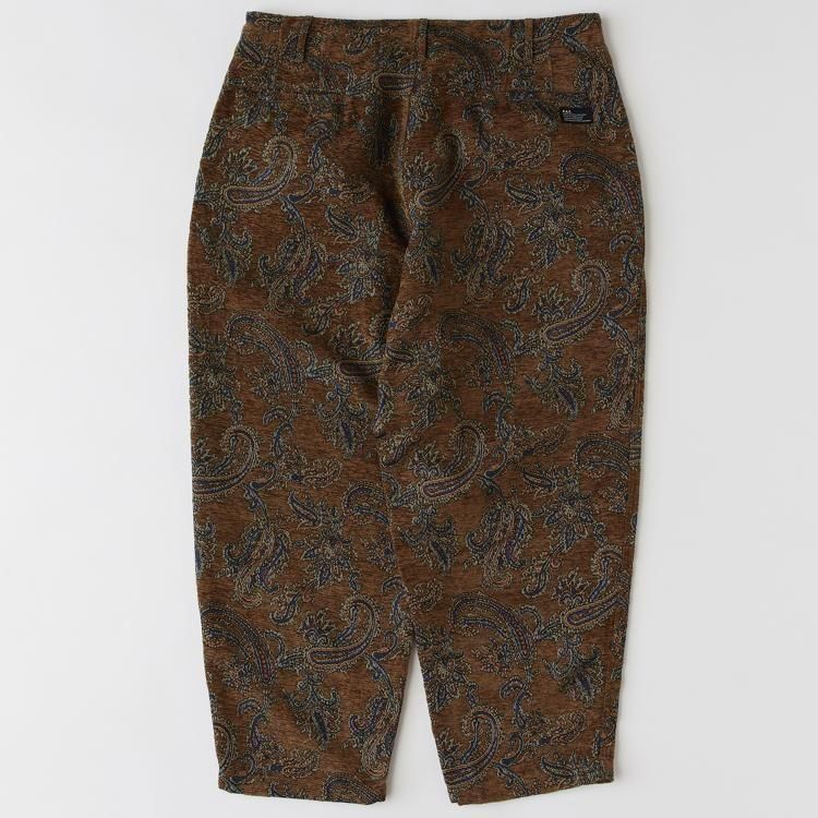 暖かみのある絶妙なカラーリングのゴブランジャガード素材を使用したワイドパンツ。股上を深くし、渡りを広くとることによりヒップから膝にかけてボリュームを持たせたワイドテーパードに加え、ジャストレングスによる独特なシルエットが魅力。穿き心地の良さはもちろんのこと、ドローコードを備え、ベルトレスでイージーパンツとして着用可能。フロントのロゴ刺繍とバックのブランドネームがさり気なく主張してくれる。