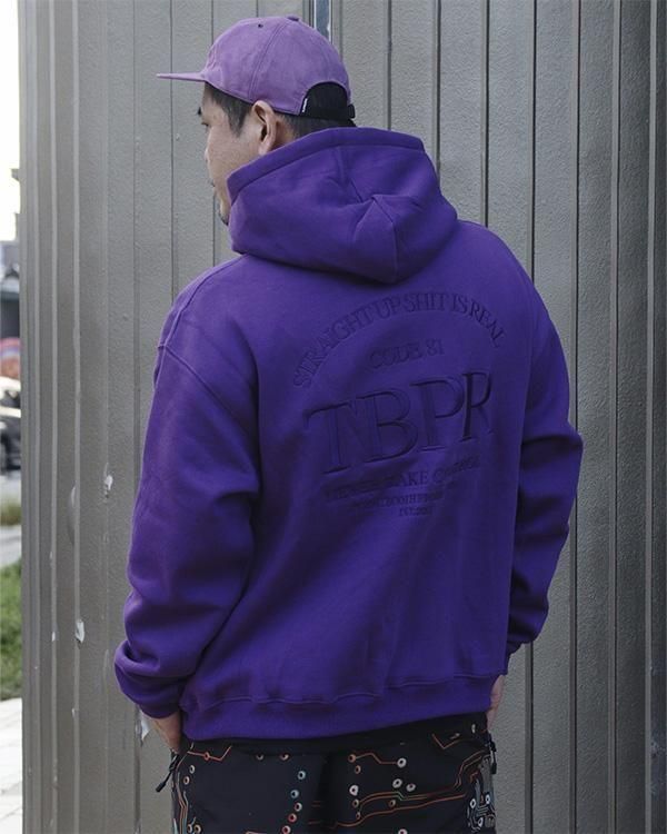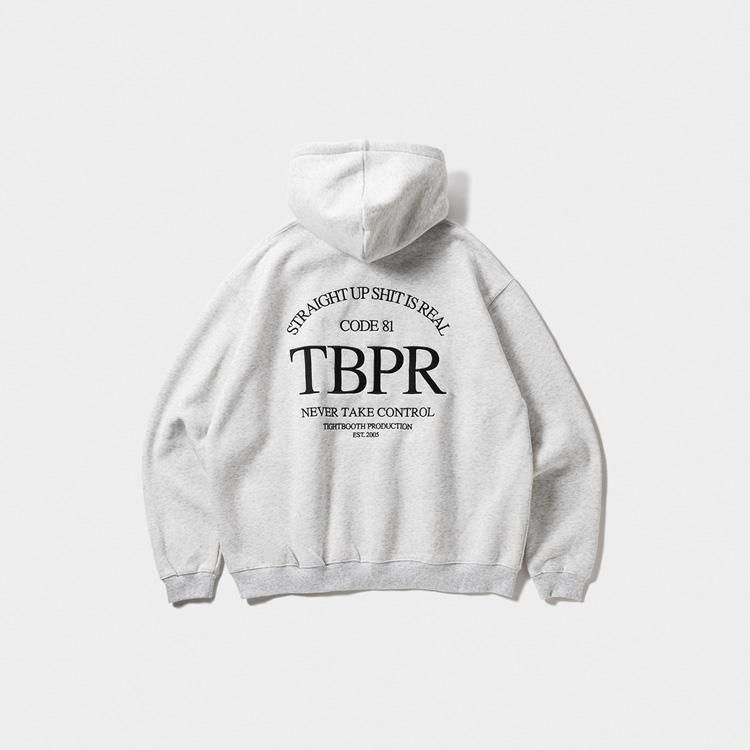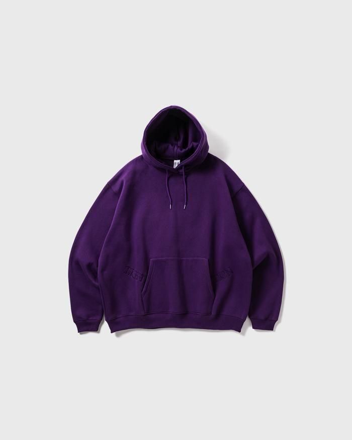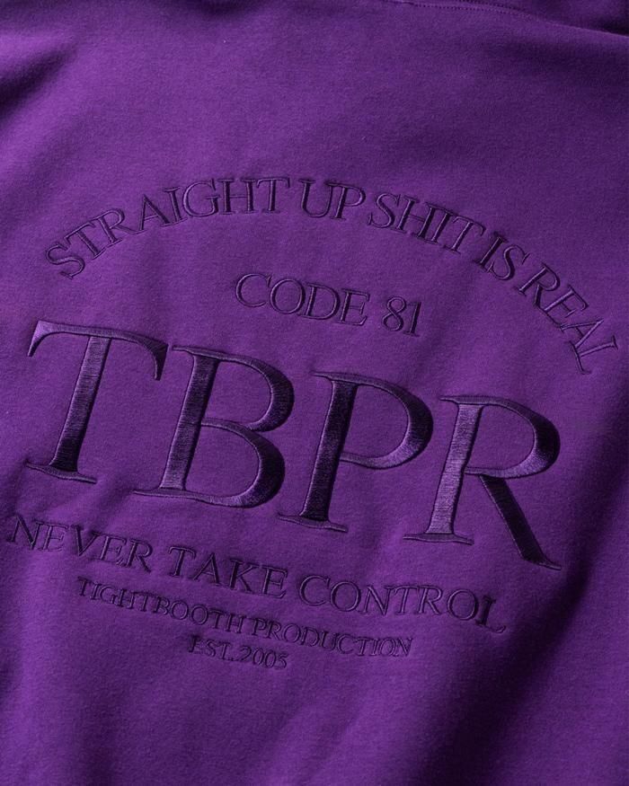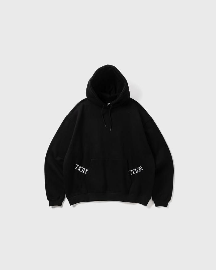 前身頃のカンガルーポケットをくぐるようにTIGHTBOOTH PRODUCTIONの文字を曲線状に刺繍。