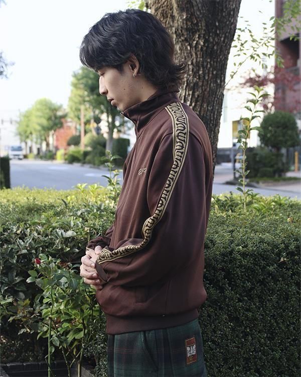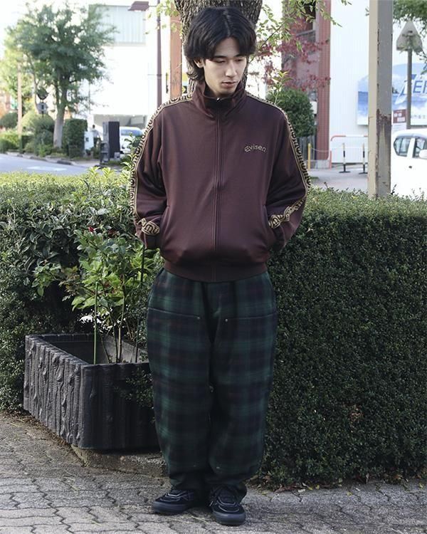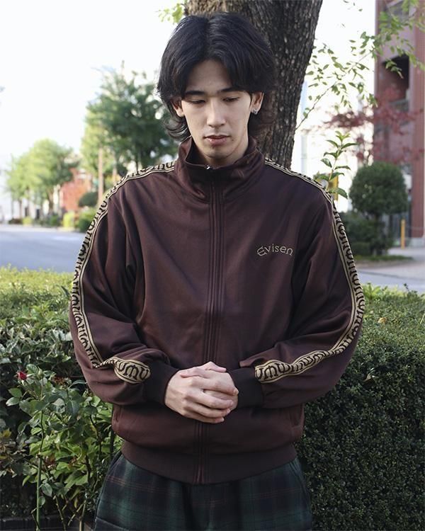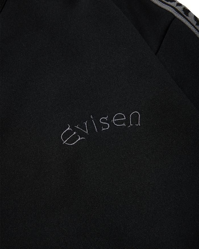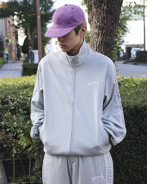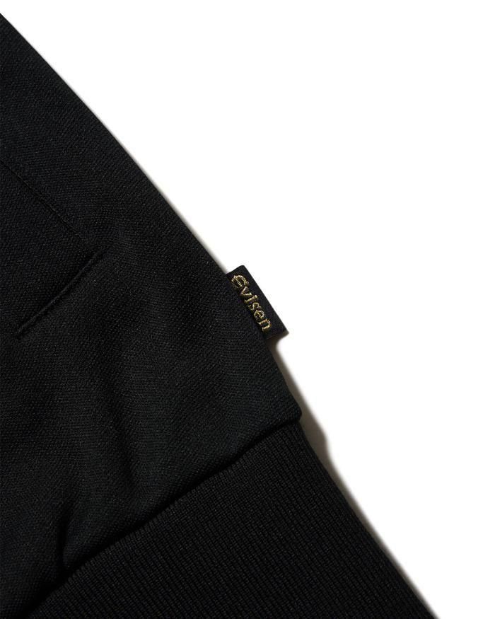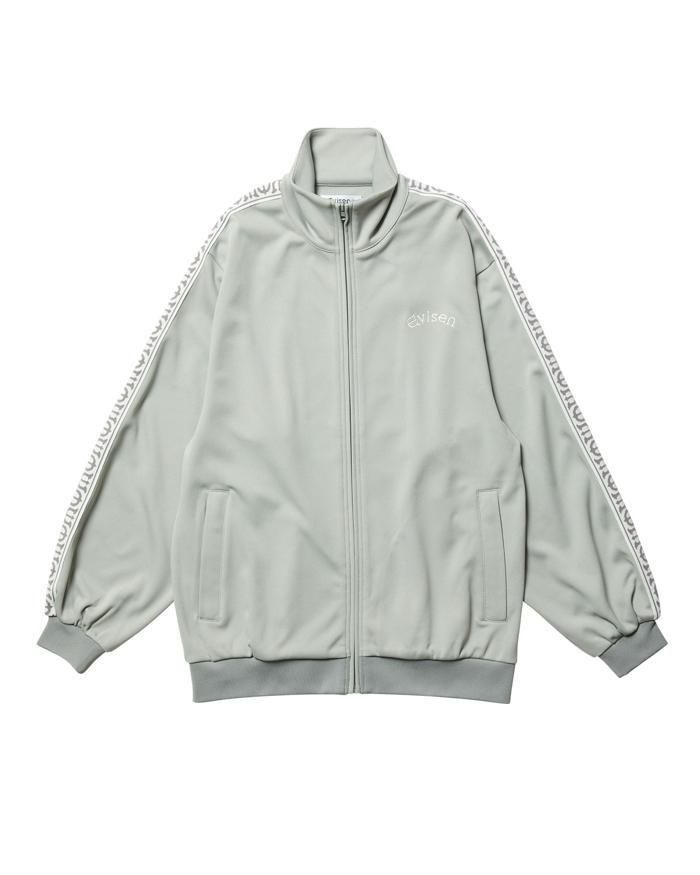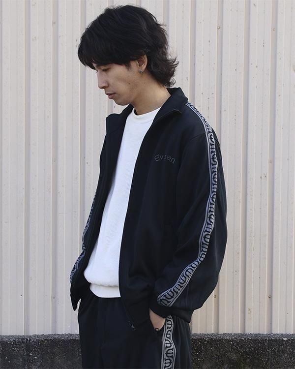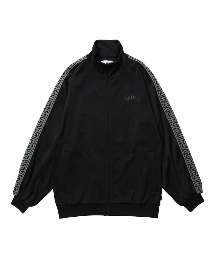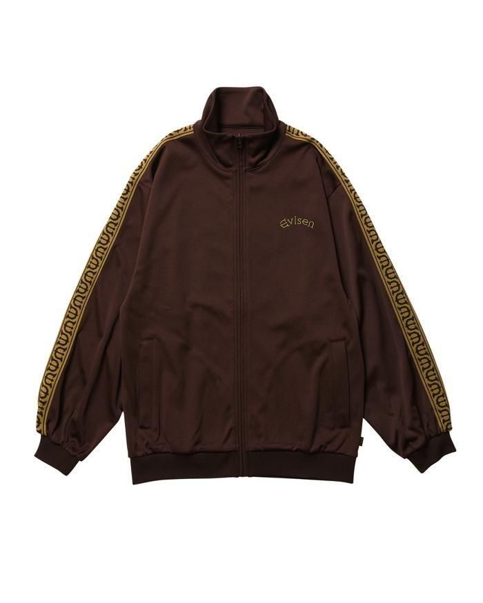 Eロゴジャカードテープがポイントのスタンドカラーのトラックジャケット。程よい厚みと弾力、ストレッチ性のある滑らかな質感の3段スムースジャージ素材を使用。フロントオープニングはシングルファスナー仕様。左胸にEvisenの文字の刺繍入りです。Eロゴジャカードテープは首元から袖口に配置。左右の腰ポケットには安心のファスナー付き。袖口と裾はリブ仕様。サイドシーム左下にピスネーム付き。