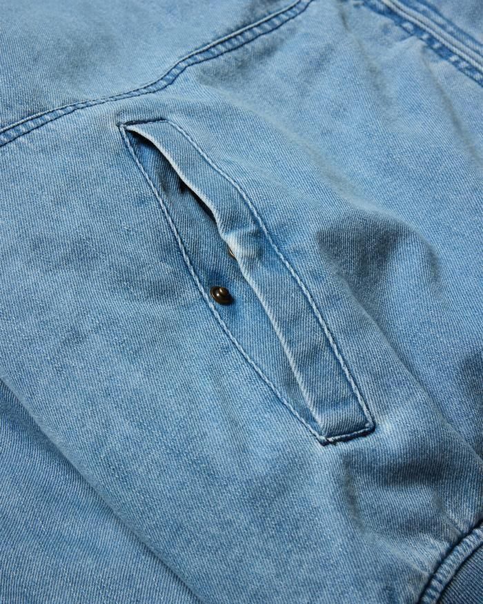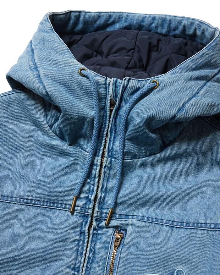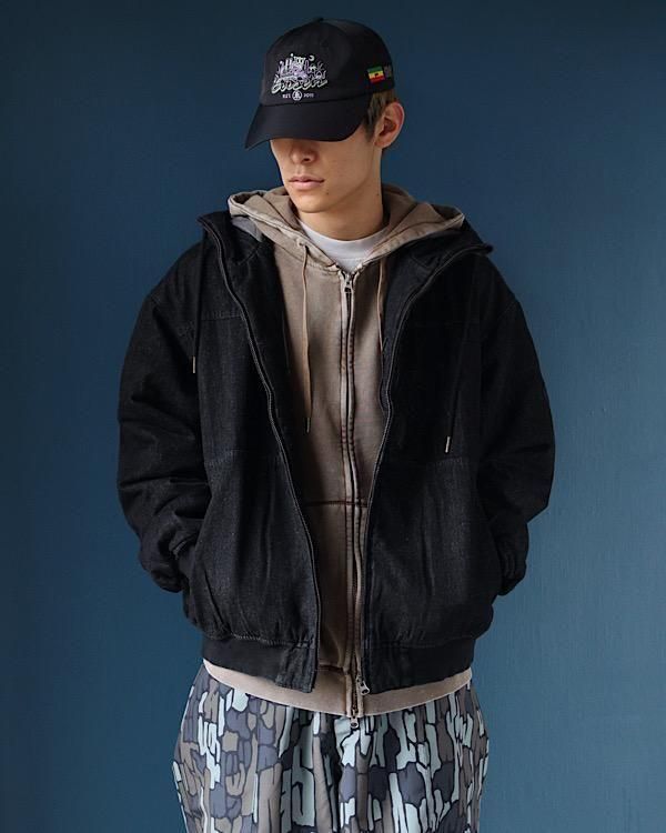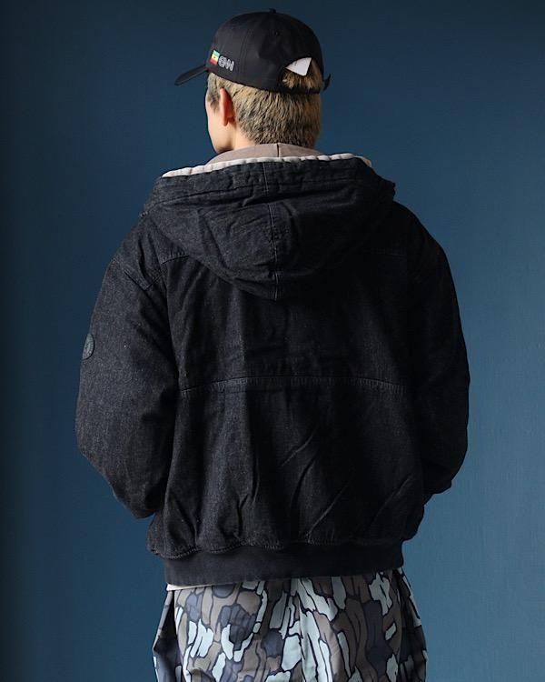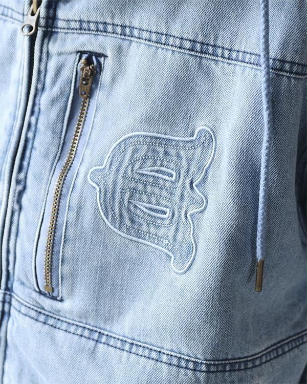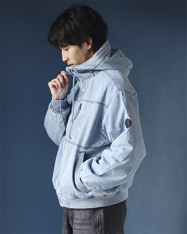 洗いをかけたデニム素材を使用したフード付きジャケット。