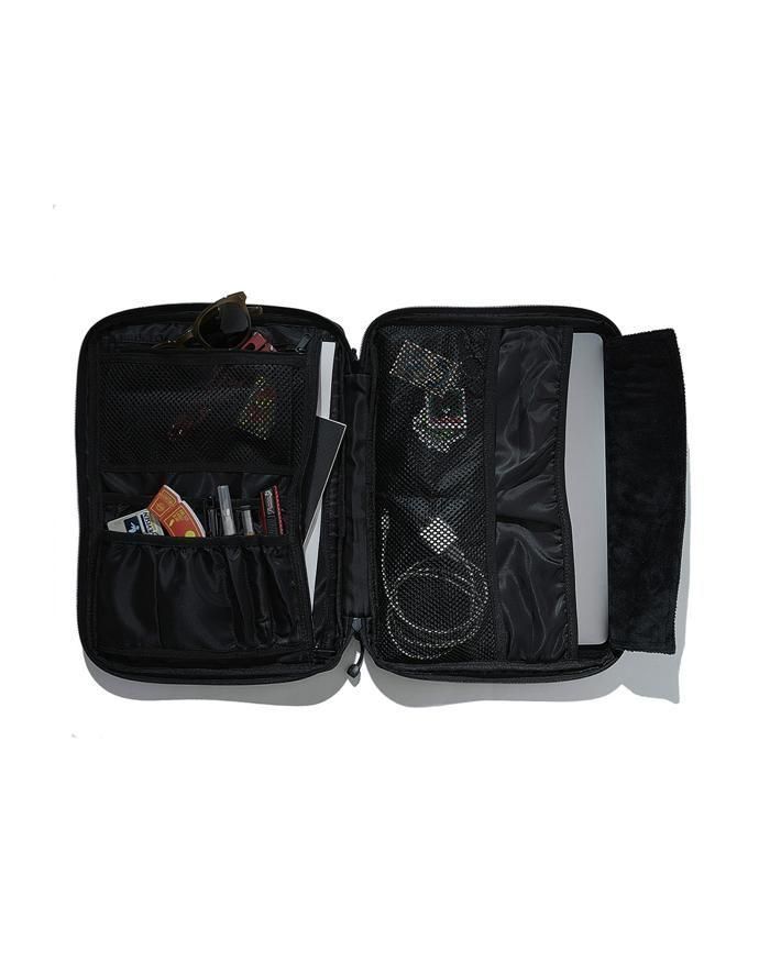 内装はファスナーやメッシュ、パイル素材を用いて様々なアイテムが収納できるよう機能的なデザインに。