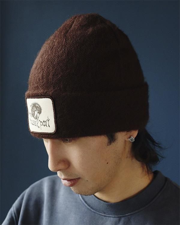 バンクシア ビーニーは、100%アクリルモヘア製で、フロントの折り返し部分にスクリーンプリントのメロウエッジパッチが施されています。