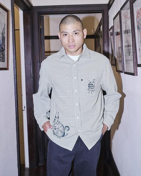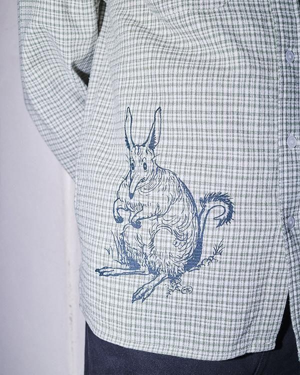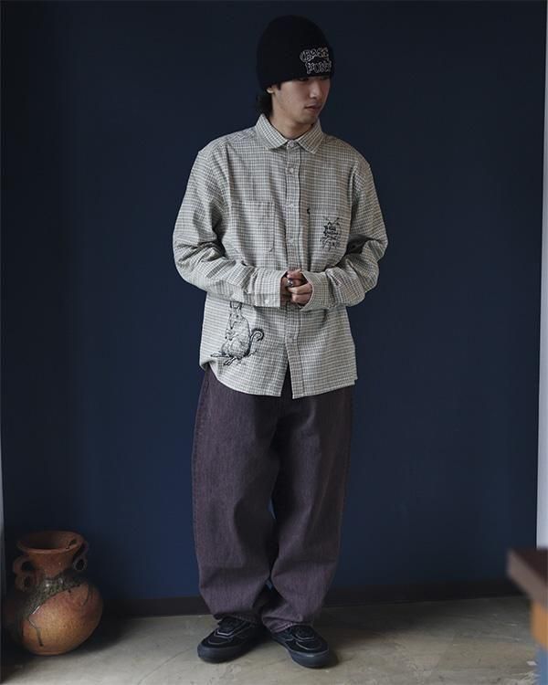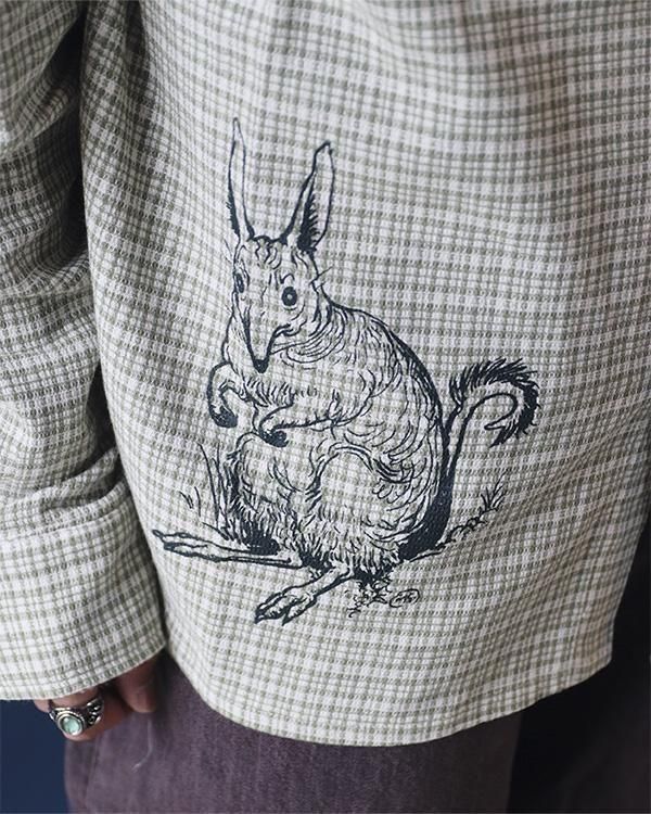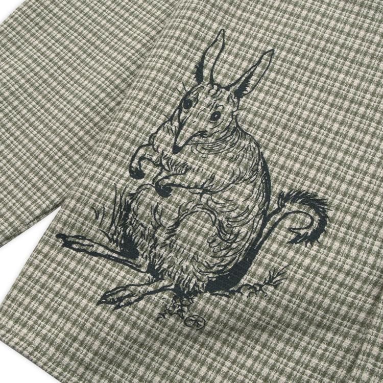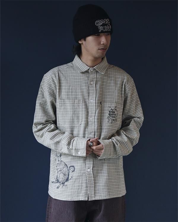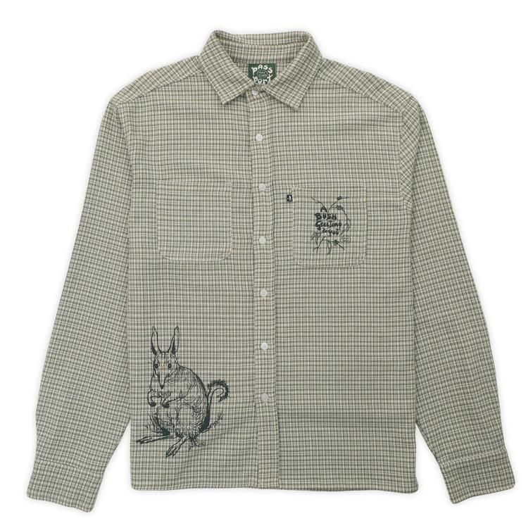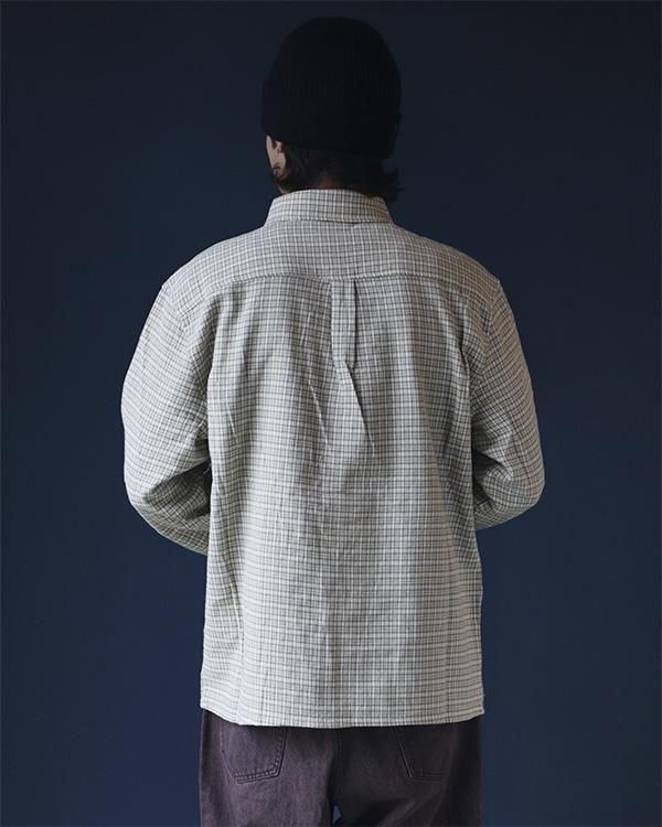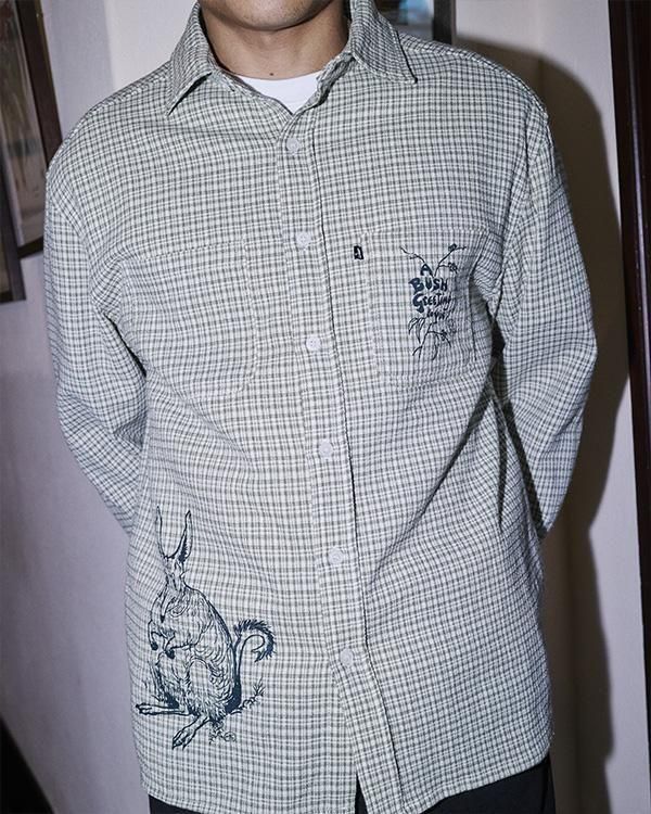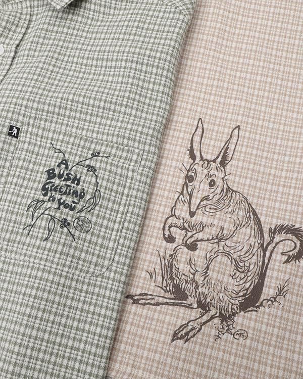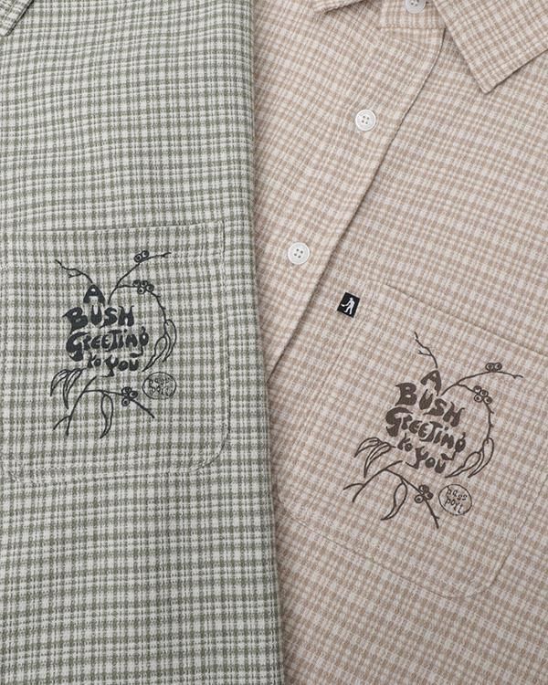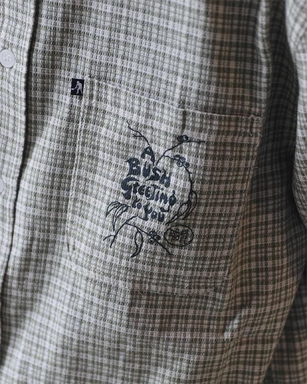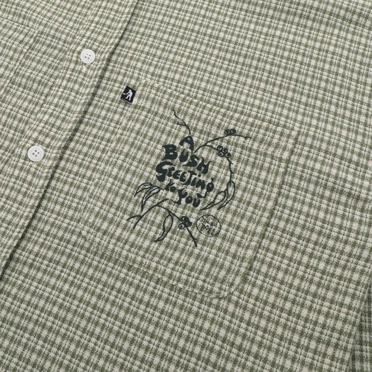 ブッシュグリーティング・ワーカーズチェックシャツは、リサイクルボタンを使用した100%コットン製です。フロントにはスクリーンプリントのデザイン、ダブルチェストポケット、織りピップラベルが特徴です。