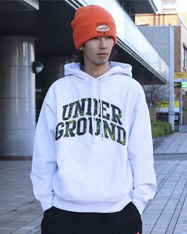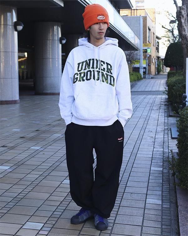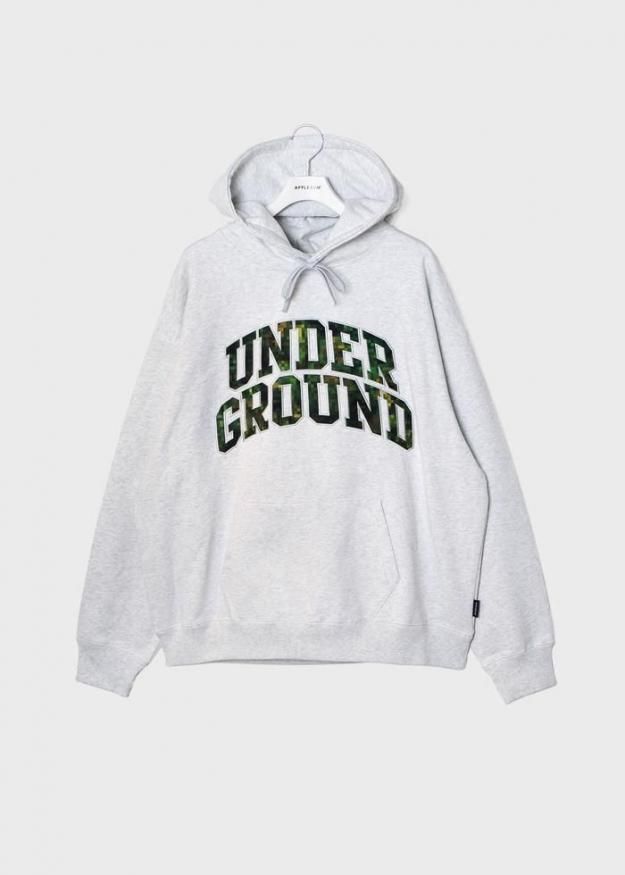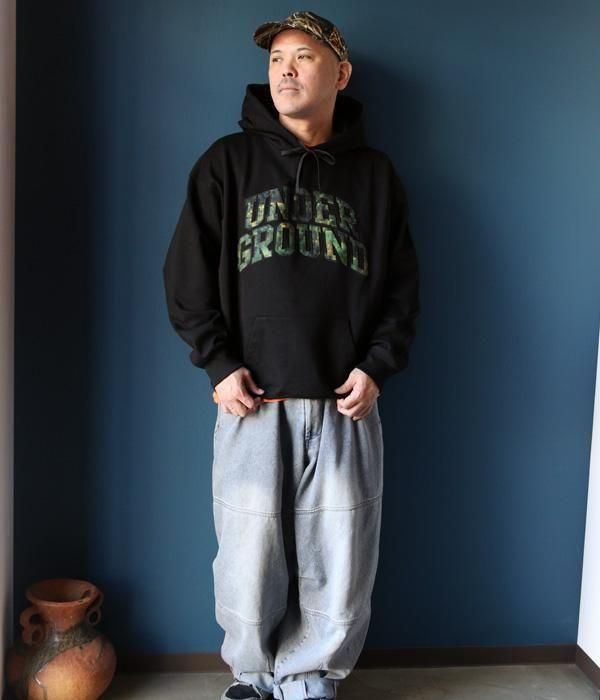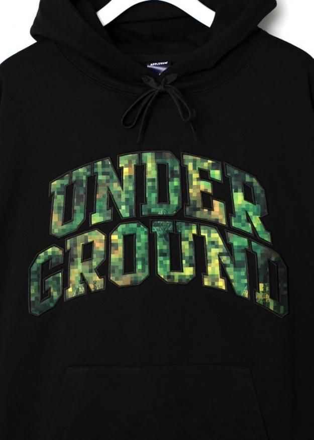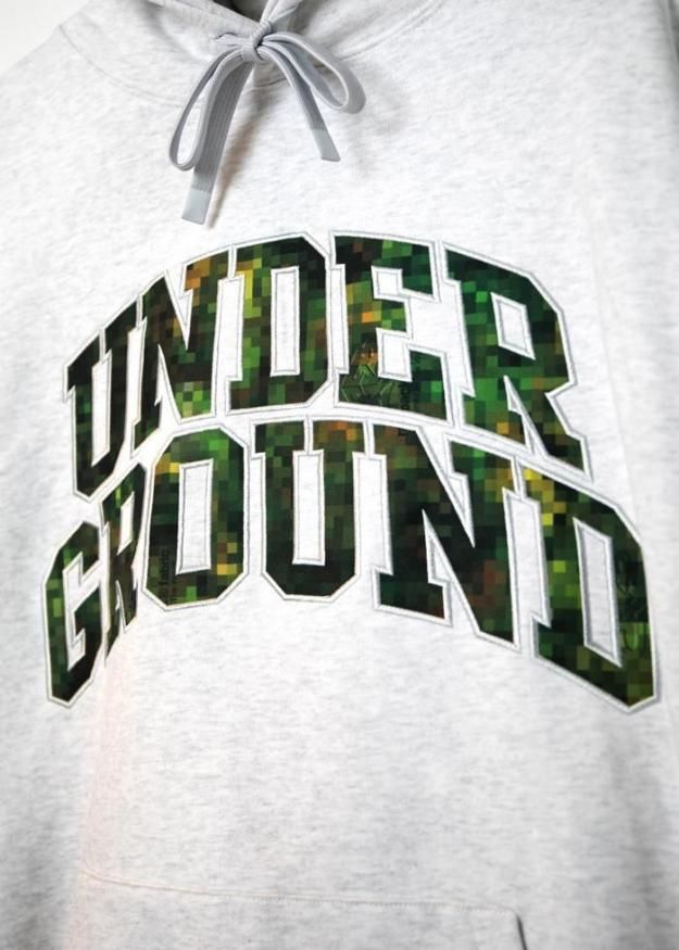 フード部分には両ブランドのロゴをさりげなく配置し、フロントには、raidback fabricのシグネチャーでもあるピクセルカモ柄で「UNDERGROUND」の文字を表現。